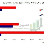 در نمودار بعد همچنین مشخص است سهم دو بانک آینده و سرمایه و موسسه اعتباری ملل از کل اضافه برداشت شبکه بانکی که در سال ۱۴۰۰ بیش از ۹۰ درصد اضافه برداشت را تشکیل میداده است، در سال ۱۴۰۲ به ۶۰ درصد اضافه برداشتها رسیده است. یعنی اگر در سال ۱۴۰۰ تقریبا ۹۰ اضافه برداشت متعلق به این بانکهای ناتراز و ناسالم بوده است، در سال ۱۴۰۲ سهم آنها کاهش یافته و دیگر بانکهای شبکه بانکی نیز به اضافه برداشت مبتلا شدهاند. بانکهایی که پیش از این دچار اضافه برداشت نبودهاند چگونه طی این دو سال به یکباره همگی عملکردی ضعیف داشته و با کسری حساب جاری(ذخایر) مواجه شدهاند؟